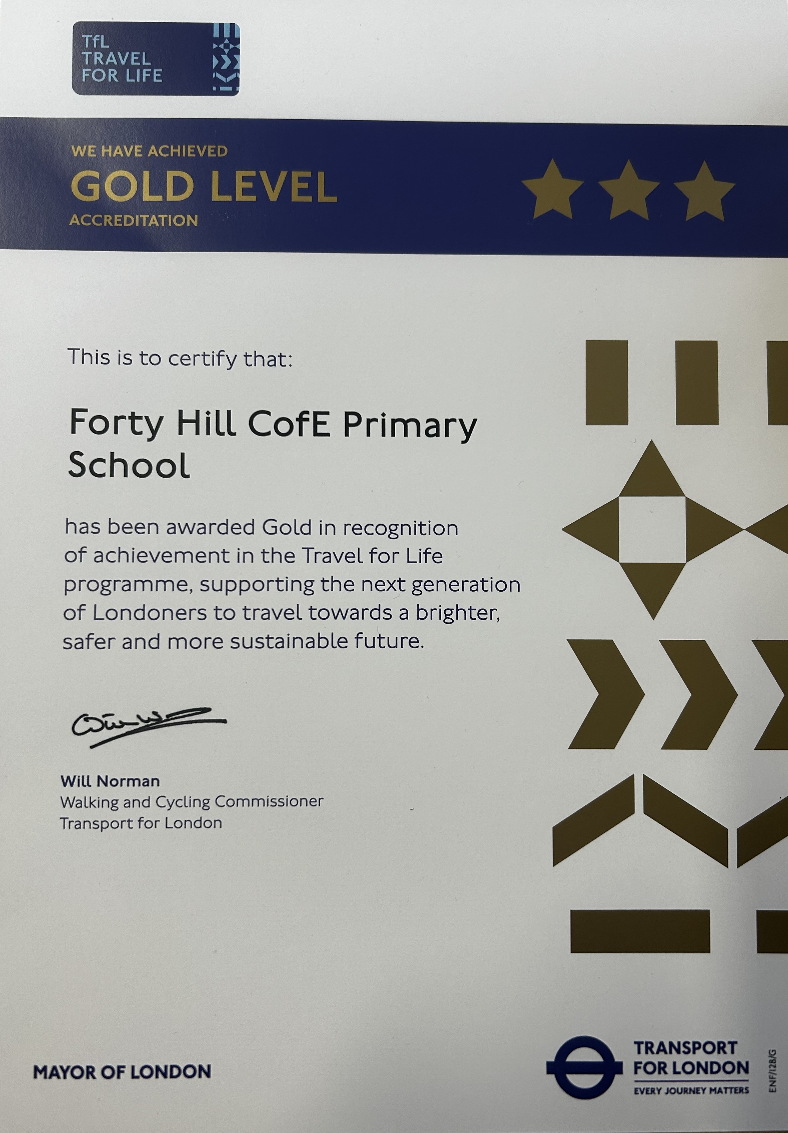 We are very proud to be a Gold Level Accredited school as part of the TFL STAR Safe and Sustainable Travel Scheme. Throughout the year we promote the benefits to our health and the environment of travelling to school by foot, bicycle, public transport, scooter and any form of travelling that keeps us fit and does not pollute our lovely world.