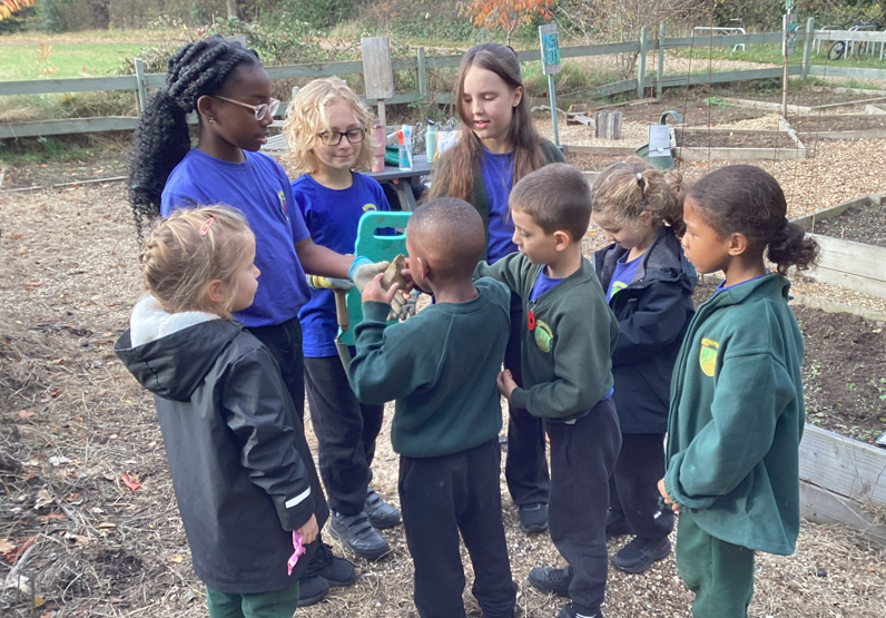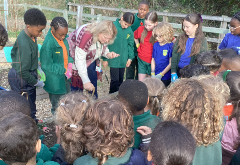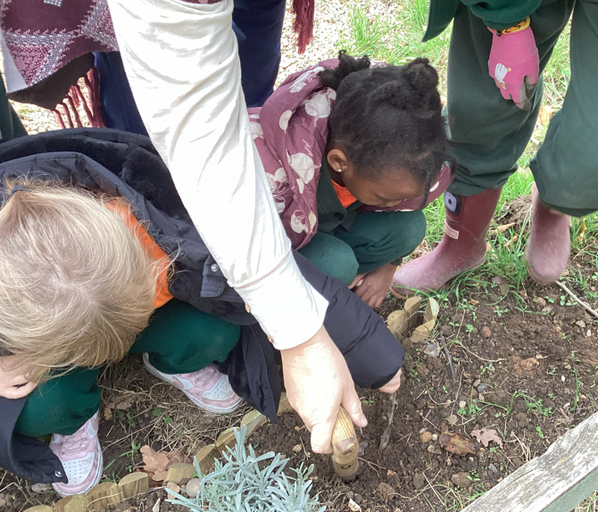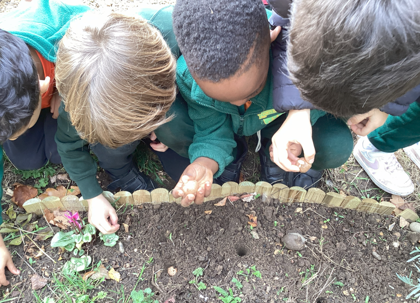 Year 1 planting crocus bulbs to support the Purple for Polio Charity with the Rotary Club Edmonton (supported by Y5/6 Gardening College) – Reaching Out Project -November 2025