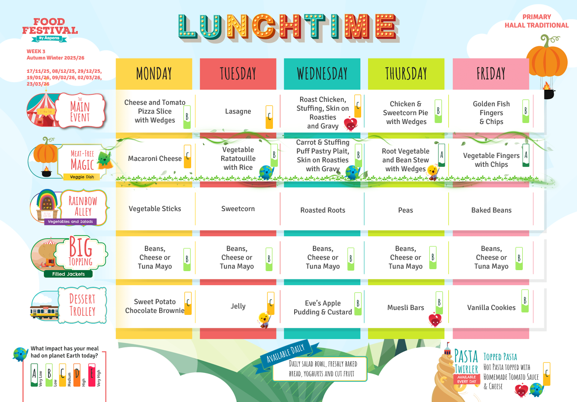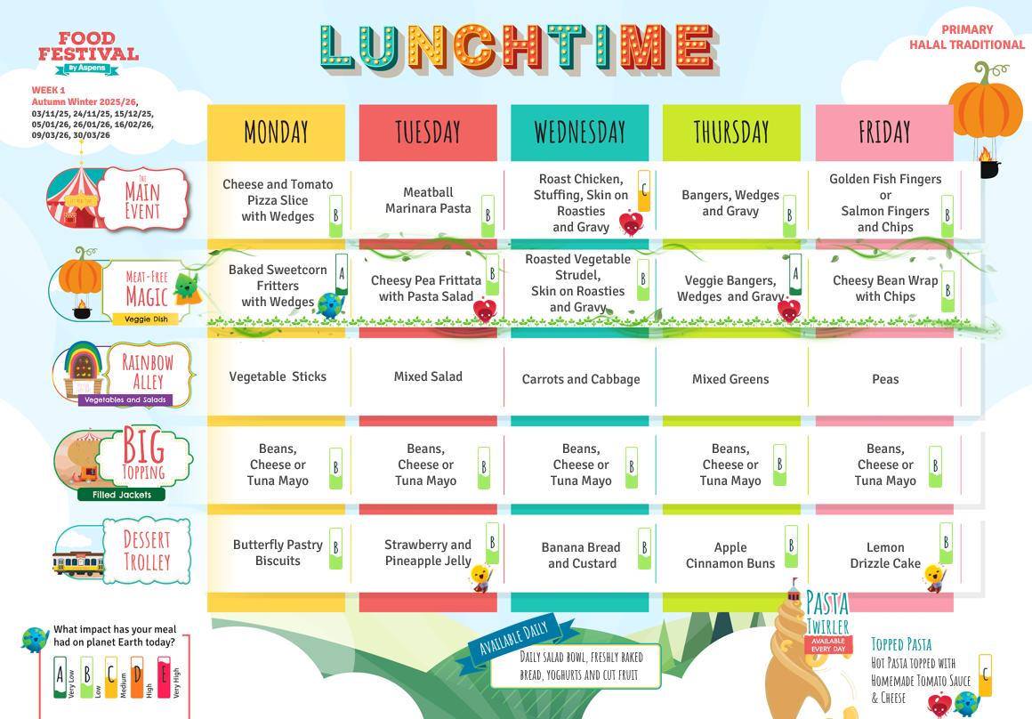 Our new catering company, Aspens, introduced their fabulous new menu in September 2023. Please take a look at the new three-week rolling menu below. Please also find below the forms to complete if your child has specific allergies or dietary requirements, as this will need be completed to send to the new catering company.